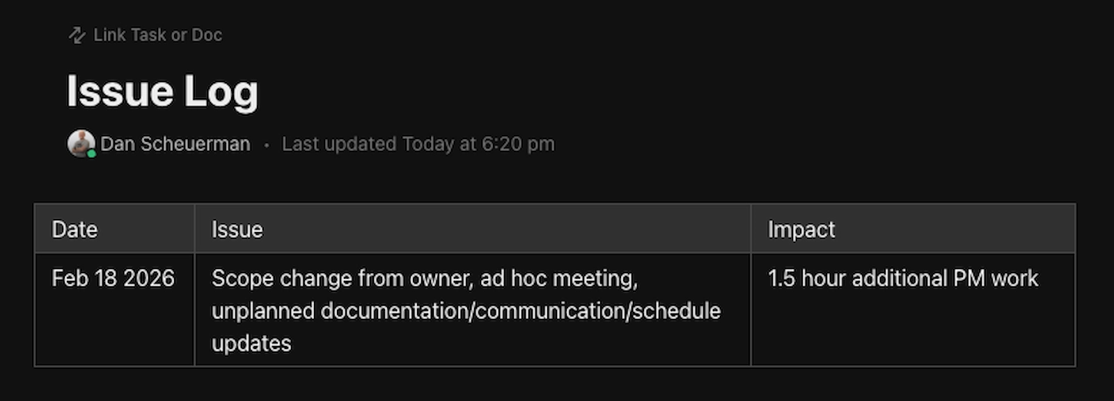 This helps clarify two things which are challenging without data: context to the impact of negative project events on time estimates, and more visibility into the PM's workload.