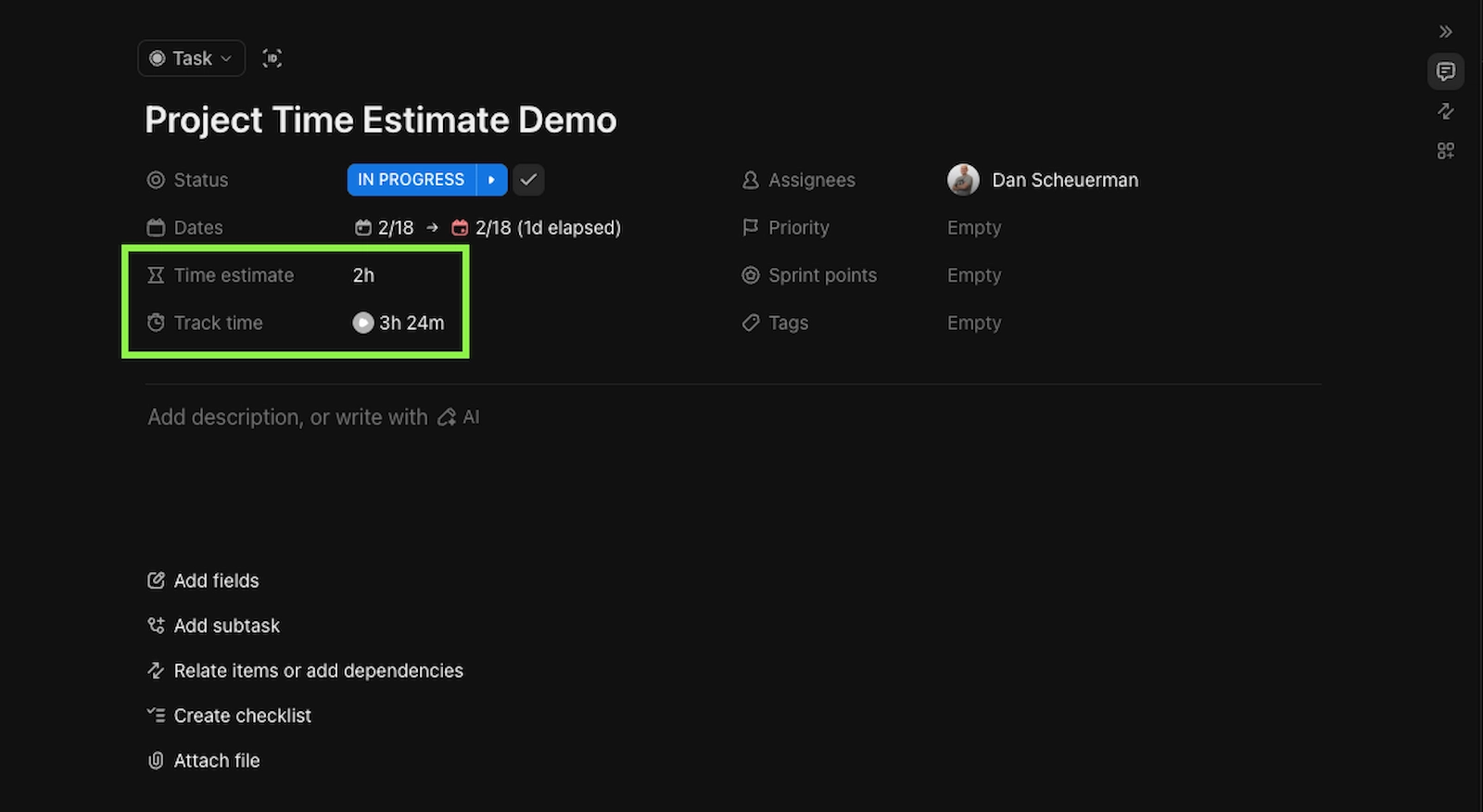 Rize automatically records estimated and actual time for every ClickUp task -- no manual export required. Both figures are visible in the task view, and the tracked times are the entries automatically synced from Rize.