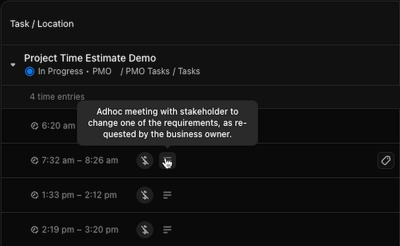 You can track tasks down to 5 min blocks. For the sake of simplicity, I'm demonstrating larger blocks of time. The Yellow "Project Estimate Demo" task blocks will be used as an example.